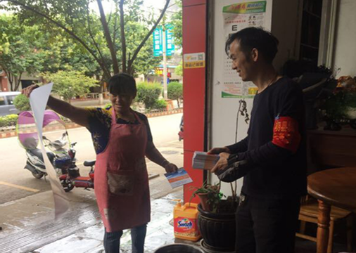 志愿者服务队队员向经营户宣讲社会主义核心价值观内容