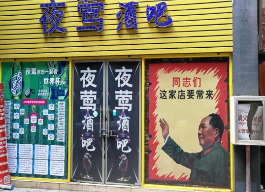 执法人员在巡查中,发现“夜莺酒吧”使用国家领导人照片作为商业宣传图片,“红公馆酒吧”使用国旗吊顶。