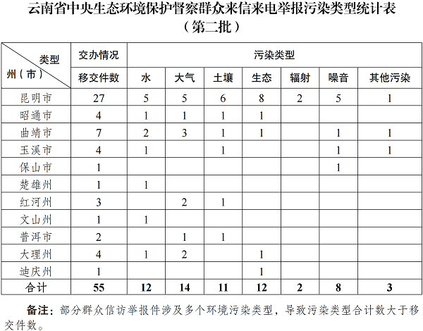 5月11日,中央第七生态环境保护督察组向云南移交第二批群众信访举报件55件,其中来电举报53件,来信举报2件。从信访举报件生态环境问题污染类型来看,涉及水12件、大气14件、土壤11件、生态12件、辐射2件、噪音8件,其他污染3件。从区域分布上看,昆明市27件、昭通市4件、曲靖市7件、玉溪市4件、保山市1件、楚雄州1件、红河州3件、文山州1件、普洱市2件、大理州4件、迪庆州1件。截至当日,云南省已累计收到中央第七生态环境保护督察组交办的信访举报件90件,所有举报件均已及时转交相关州(市)处理。