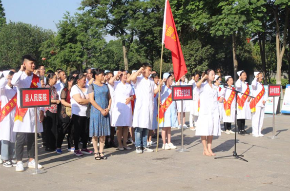 县人民医院医生杨淑嫒带领各医院家庭医生代表进行了宣誓。义诊宣传服务活动中,通过悬挂宣传条幅,摆放宣传图板、发放各类宣传单、宣传册,设置咨询、义诊、签约服务台,为群众开展宣传服务活动,使广大居民认识签约服务、了解签约服务、参与签约服务。活动中,现场为群众测量血压、血糖112人次、义诊咨询服务151人次,3个签约服务组与群众现场签订“家庭医生服务协议”105份。