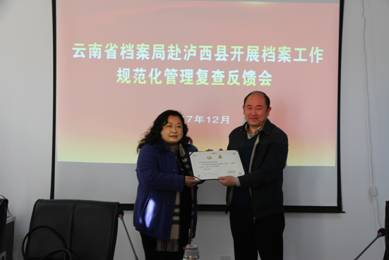 在复查反馈会上,段俐娟副局长充分肯定了我县档案工作取得的成绩,并要求,要以党的十九大精神为统领,充分认识新时代档案工作面临的形势、任务,提高依法治档能力,切实履行好为党管档、为国守史、为民服务的职责;要进一步加强档案资源体系建设,加大民生档案、地方民族档案、重大活动档案的接收征集力度,着力丰富馆藏,优化结构;要以规范化管理复查为抓手,进一步推进档案工作科学化、规范化、精细化管理水平;要切实加强档案信息化建设,群策群力,主动作为,积极推进数字档案馆(室)建设工作;要加强档案人才队伍建设,积极提升档案专兼职人员履职能力,努力打造高素质的档案队伍,充分发挥好档案 “存凭、留史、资政、育人”的作用。