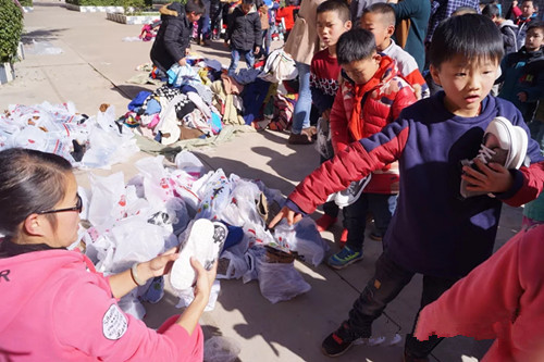 当天,学校就举行了爱心捐赠物资发放活动。在捐赠活动中,老师们都积极投入到物资整理中。此次爱心物资除由桐乡义工在桐乡义工爱心捐赠物资仓库里整理出来的体育用品、学习用品、生活用品外,还有嘉兴恒美送来的十多包约六百件的新棉外套,广州满天宏送来的600余双新鞋子,总价值30多万元,义工们的爱心捐赠给山口的孩子们送来了冬日里的温暖!当物资发到学生们手中时,孩子们脸上的笑容比吃了蜜还甜。捐赠活动上,山口小学校长赵鹏真对浙江桐乡义工的爱心之举表示真诚的感谢,他希望同学们好好学习,天天向上,学会感恩,长大后成为社会的有用之才,帮助需要帮助的人。之后,各班都开展了以感恩教育为主题的班会。同学们都纷纷写了感谢信,感谢这群素未谋面的叔叔阿姨们。