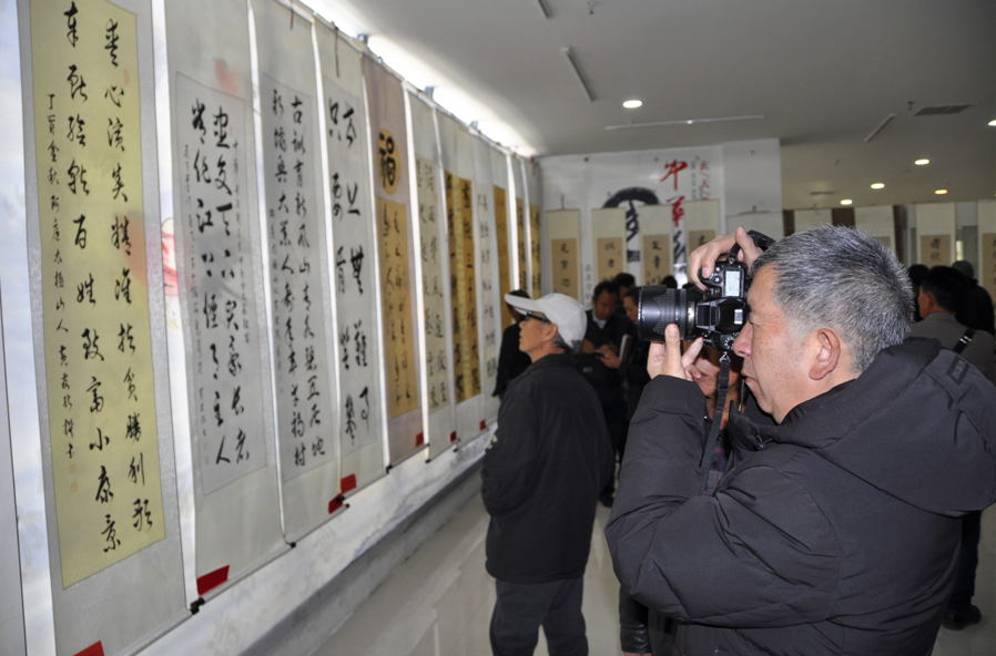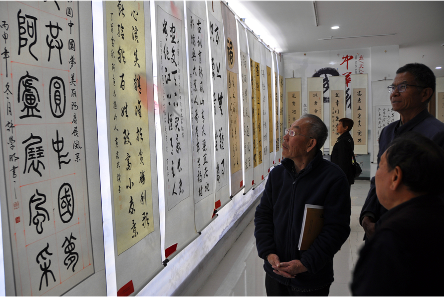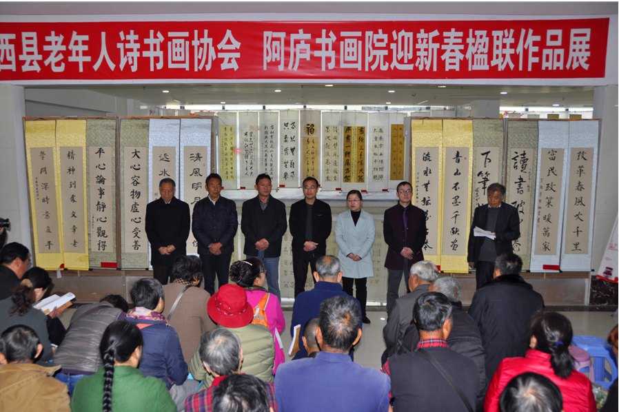 泸西县举办迎新春楹联作品展 泸西县委宣传部副部长马学春、县文联主席及县书法家协会主席等领导出席活动进行指导。活动还邀请到罗平县、师宗县的老年诗书画协会主席。参加活动的还有老年诗书画协会、阿庐书画院领导及部分会员等共计80余人。