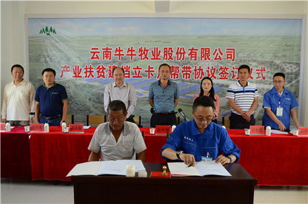 8月30日下午,云南牛牛牧业股份有限公司与建档立卡贫困户签订产业扶贫帮带协议,并举行签订仪式。县委副书记、县驻村扶贫工作队总队长石永林,县委常委、县人民政府副县长施佳辰,县人民政府副县长周宏伟出席仪式。牛牛牧业股份有限公司总经理孙志海与无浪村委会30余户建档立卡贫困户签订扶贫帮带协议。