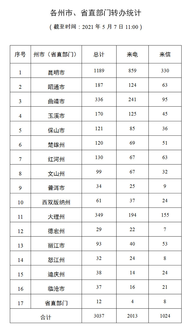 截至5月7日上午11:00,督察组交办群众举报投诉生态环境问题共三十一批3037件(来电2013件、来信1024件);其中,昆明市1189件,大理州349件,曲靖市336件,昭通市187件,玉溪市170件,红河州130件,保山市121件,楚雄州120件,文山州99件,丽江市93件,西双版纳州61件,迪庆州38件,临沧市37件,普洱市34件,怒江州32件,德宏州29件,省直部门直接办理12件。