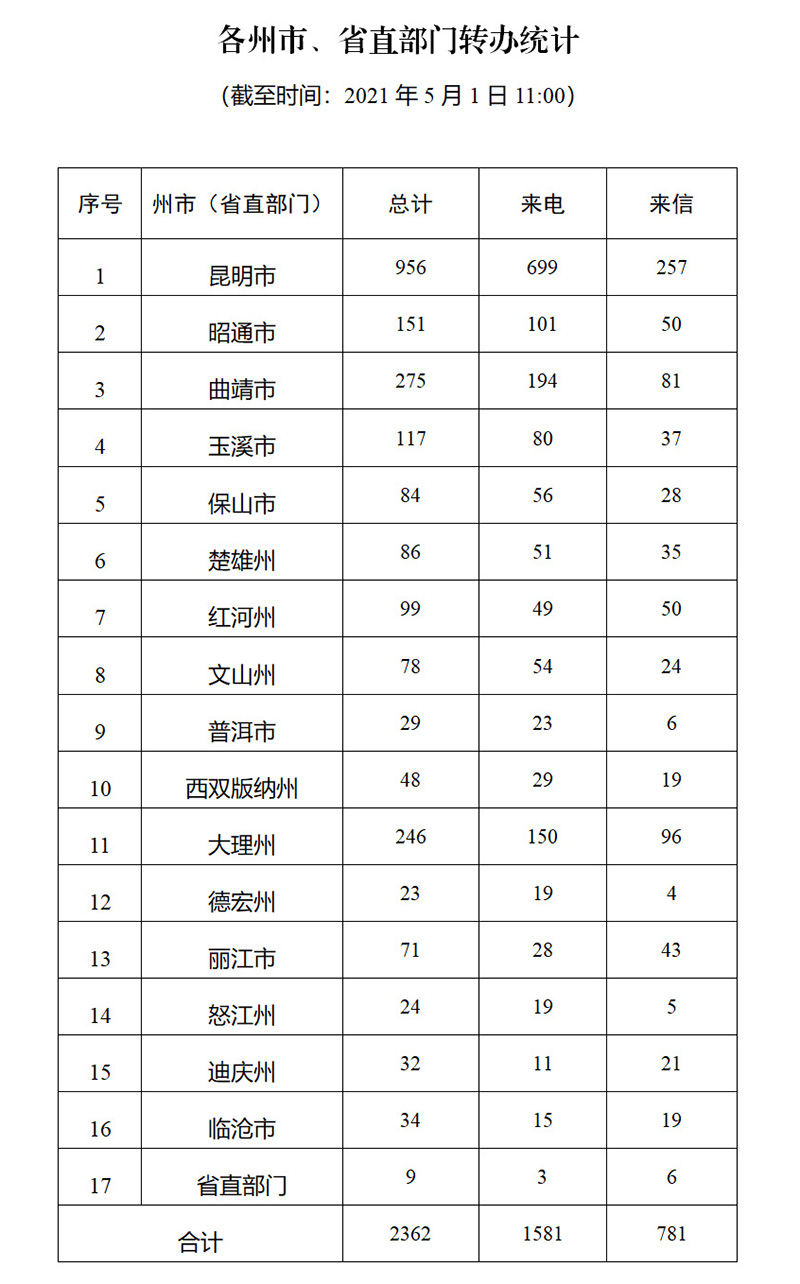 截至5月1日上午11:00,督察组交办群众举报投诉生态环境问题共二十五批2362件(来电1581件、来信781件);其中,昆明市956件,曲靖市275件,大理州246件,昭通市151件,玉溪市117件,红河州99件,楚雄州86件,保山市84件,文山州78件,丽江市71件,西双版纳州48件,临沧市34件,迪庆州32件,普洱市29件,怒江州24件,德宏州23件,省直部门直接办理9件。