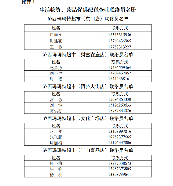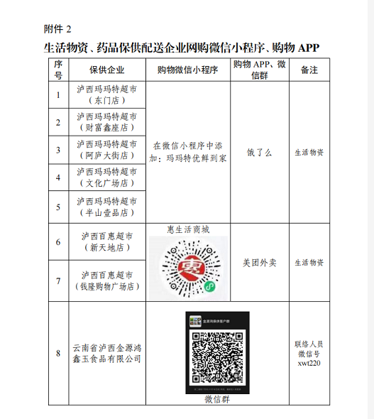 为进一步做好疫情期间生活物资供应保障工作,高效、精准、科学完成配送任务,确保县城区物资供应通畅,县应对疫情工作领导小组指挥部结合片区网格化管理实际,制定本供应方案,现通告如下。原则上按照就近、方便的原则指定相应的超市进行物资配送,减少人员跨片区流动。具体划分如下:(一)泸西玛玛特超市(东门店)负责配送:焰山社区(1—6网格)、新华社区(1—14 网格)、泸东社区(1—5 网格)、民主社区 12 网格。(二)泸西玛玛特超市(财富鑫座店)负责配送:钟秀社区(1—15 网格)、民主社区(2—11、14 网格)。(三)泸西百惠超市(新天地店)负责配送:长安社区(1—19 网格)、民主社区(1、13 网格)、胜利社区(18 网格)。(四)泸西百惠超市(钱隆购物广场店)负责配送:桃笑社区(1—13 网格)、石洞社区(1 网格)、胜利社区(1、4、5网格)。(五)云南省泸西金源鸿鑫玉食品有限公司负责配送:迎宾社区(1—14 网格)。(六)泸西玛玛特超市(阿庐大街店)负责配送:胜利社区(2、3、6—17 网格)。(七)泸西玛玛特超市(文化广场店)负责配送:瓦窑社区(1—12 网格)、阿庐社区(1—8 网格)。(八)泸西玛玛特超市(半山壹品店)负责配送:瓦窑社区(13—16 网格)、阿庐社区(9—17 网格)。(一)生活物资。保供片区责任企业上一天 18 时前在购物微信小程序、美团外卖、饿了么 APP 或客户微信群推送第二天的基本生活物资种类及价格。客户在微信小程序、APP 或微信群完成下单支付,保供责任企业进行配货。注:企业配货人员应标注好住户地址、姓名、联系方式等基本信息方便配送。(二)药品。客户可通过美团外卖、饿了么 APP 选择距住所最近的指定药店下单订购。(一)各保供企业指定专人按地址进行配送,配送至卡点物资存放处(各值守点根据实际地点进行合理设置)联系住户领取物资,特别注意:物资交接时不得直接接触,同时配送员必须对物资外包装进行消毒。(二)配送企业当日接单,于次日进行配送。配送企业接单时间为:8∶00 时至 20∶00 时止。(三)片区内无法使用手机进行支付的特殊人群,由该片区对应网格长帮忙下单购物。(四)配送人员相对固定,开展每日一次的核酸检测,核酸结果正常方可开展配送工作。在配送过程中,需穿戴隔离服、N95 口罩、橡胶手套,原则上不得跨片区配送。原则上住户一次下单能满足 2—3 天基本生活物资的量。在各企业推送的微信小程序、美团外卖、饿了么 APP、微信客户群上进行线上下单、线上支付,不能实现网络购物的住户报片区网格长协调处理。