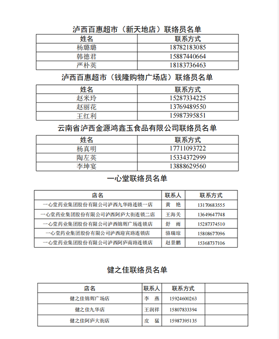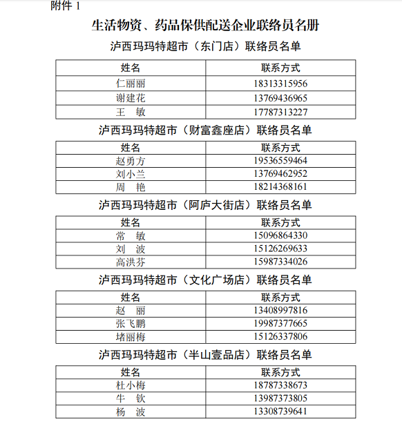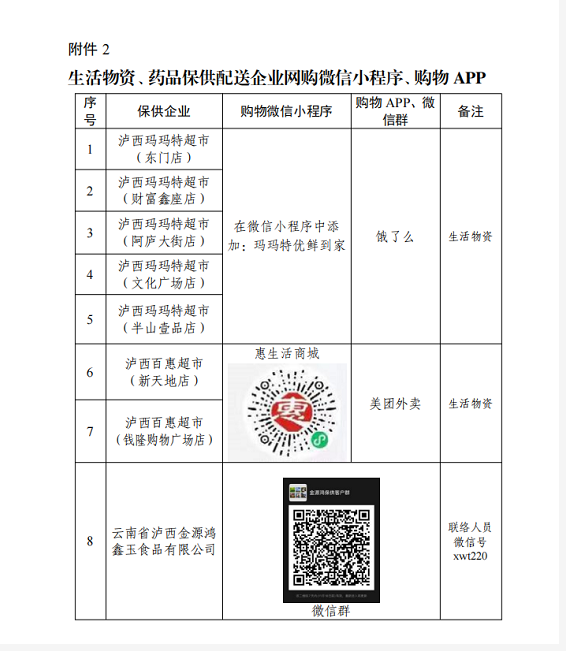 为进一步做好疫情期间生活物资供应保障工作,高效、精准、科学完成配送任务,确保县城区物资供应通畅,县应对疫情工作领导小组指挥部结合片区网格化管理实际,制定本供应方案,现通告如下。原则上按照就近、方便的原则指定相应的超市进行物资配送,减少人员跨片区流动。具体划分如下:(一)泸西玛玛特超市(东门店)负责配送:焰山社区(1—6网格)、新华社区(1—14 网格)、泸东社区(1—5 网格)、民主社区 12 网格。(二)泸西玛玛特超市(财富鑫座店)负责配送:钟秀社区(1—15 网格)、民主社区(2—11、14 网格)。(三)泸西百惠超市(新天地店)负责配送:长安社区(1—19 网格)、民主社区(1、13 网格)、胜利社区(18 网格)。(四)泸西百惠超市(钱隆购物广场店)负责配送:桃笑社区(1—13 网格)、石洞社区(1 网格)、胜利社区(1、4、5网格)。(五)云南省泸西金源鸿鑫玉食品有限公司负责配送:迎宾社区(1—14 网格)。(六)泸西玛玛特超市(阿庐大街店)负责配送:胜利社区(2、3、6—17 网格)。(七)泸西玛玛特超市(文化广场店)负责配送:瓦窑社区(1—12 网格)、阿庐社区(1—8 网格)。(八)泸西玛玛特超市(半山壹品店)负责配送:瓦窑社区(13—16 网格)、阿庐社区(9—17 网格)。(一)生活物资。保供片区责任企业上一天 18 时前在购物微信小程序、美团外卖、饿了么 APP 或客户微信群推送第二天的基本生活物资种类及价格。客户在微信小程序、APP 或微信群完成下单支付,保供责任企业进行配货。注:企业配货人员应标注好住户地址、姓名、联系方式等基本信息方便配送。(二)药品。客户可通过美团外卖、饿了么 APP 选择距住所最近的指定药店下单订购。(一)各保供企业指定专人按地址进行配送,配送至卡点物资存放处(各值守点根据实际地点进行合理设置)联系住户领取物资,特别注意:物资交接时不得直接接触,同时配送员必须对物资外包装进行消毒。(二)配送企业当日接单,于次日进行配送。配送企业接单时间为:8∶00 时至 20∶00 时止。(三)片区内无法使用手机进行支付的特殊人群,由该片区对应网格长帮忙下单购物。(四)配送人员相对固定,开展每日一次的核酸检测,核酸结果正常方可开展配送工作。在配送过程中,需穿戴隔离服、N95 口罩、橡胶手套,原则上不得跨片区配送。原则上住户一次下单能满足 2—3 天基本生活物资的量。在各企业推送的微信小程序、美团外卖、饿了么 APP、微信客户群上进行线上下单、线上支付,不能实现网络购物的住户报片区网格长协调处理。