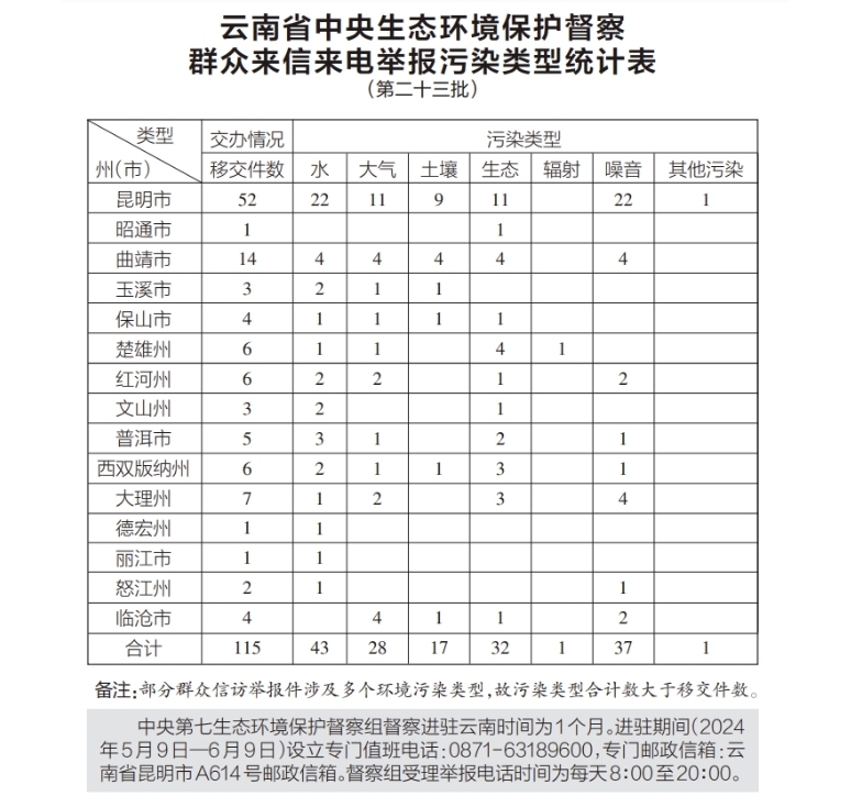 6月1日,中央第七生态环境保护督察组向云南移交第二十三批群众信访举报件115件,其中来电举报45件,来信举报70件。从信访举报件生态环境问题污染类型来看,涉及水43件、大气28件、土壤17件、生态32件、辐射1件、噪音37件、其他污染1件。从区域分布上看,昆明市52件、昭通市1件、曲靖市14件、玉溪市3件、保山市4件、楚雄州6件、红河州6件、文山州3件、普洱市5件、西双版纳州6件、大理州7件、德宏州1件、丽江市1件、怒江州2件、临沧市4件。截至当日,云南省已累计收到中央第七生态环境保护督察组交办的信访举报件2197件,所有举报件均已及时转交相关州(市)处理。
